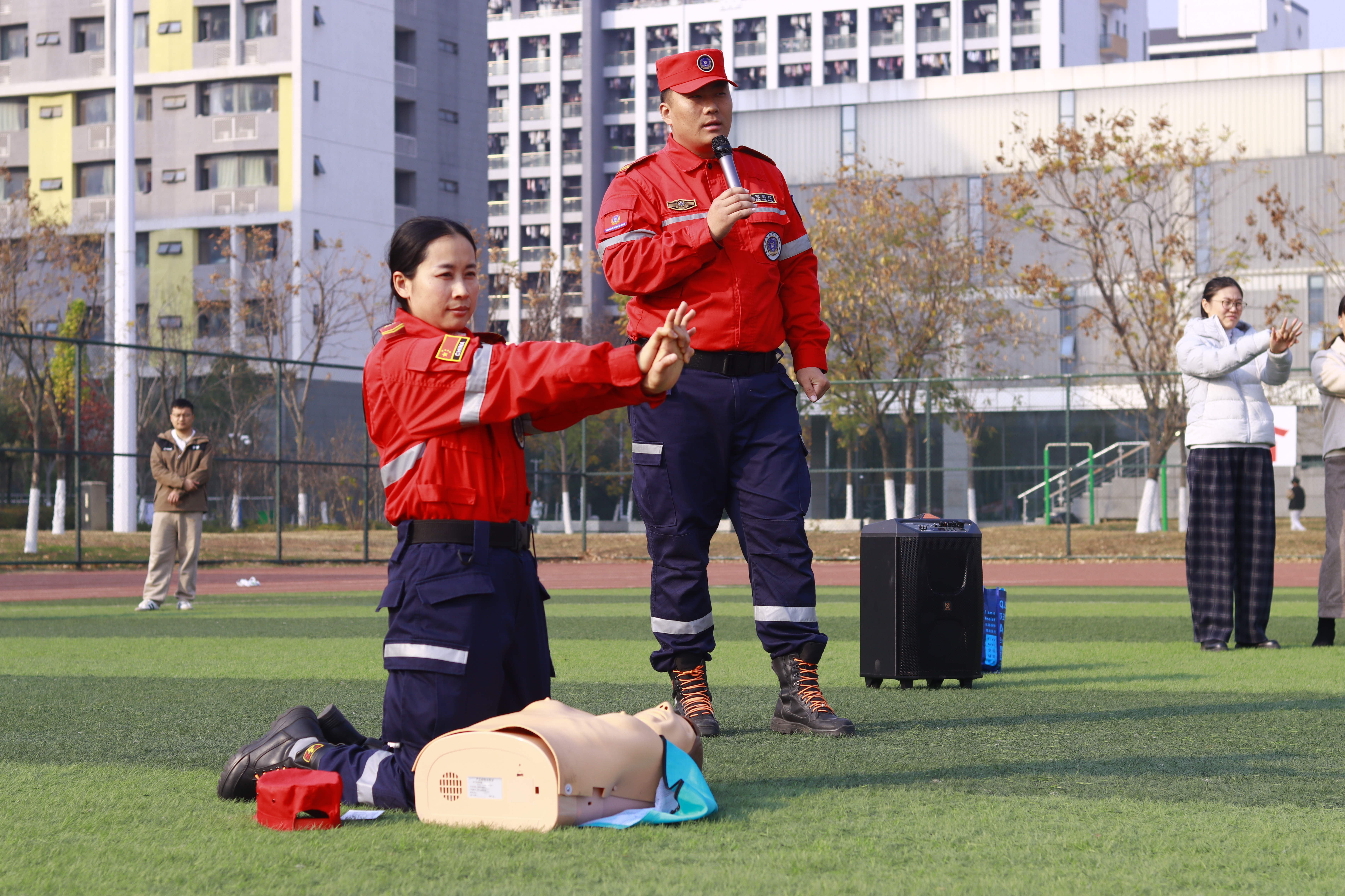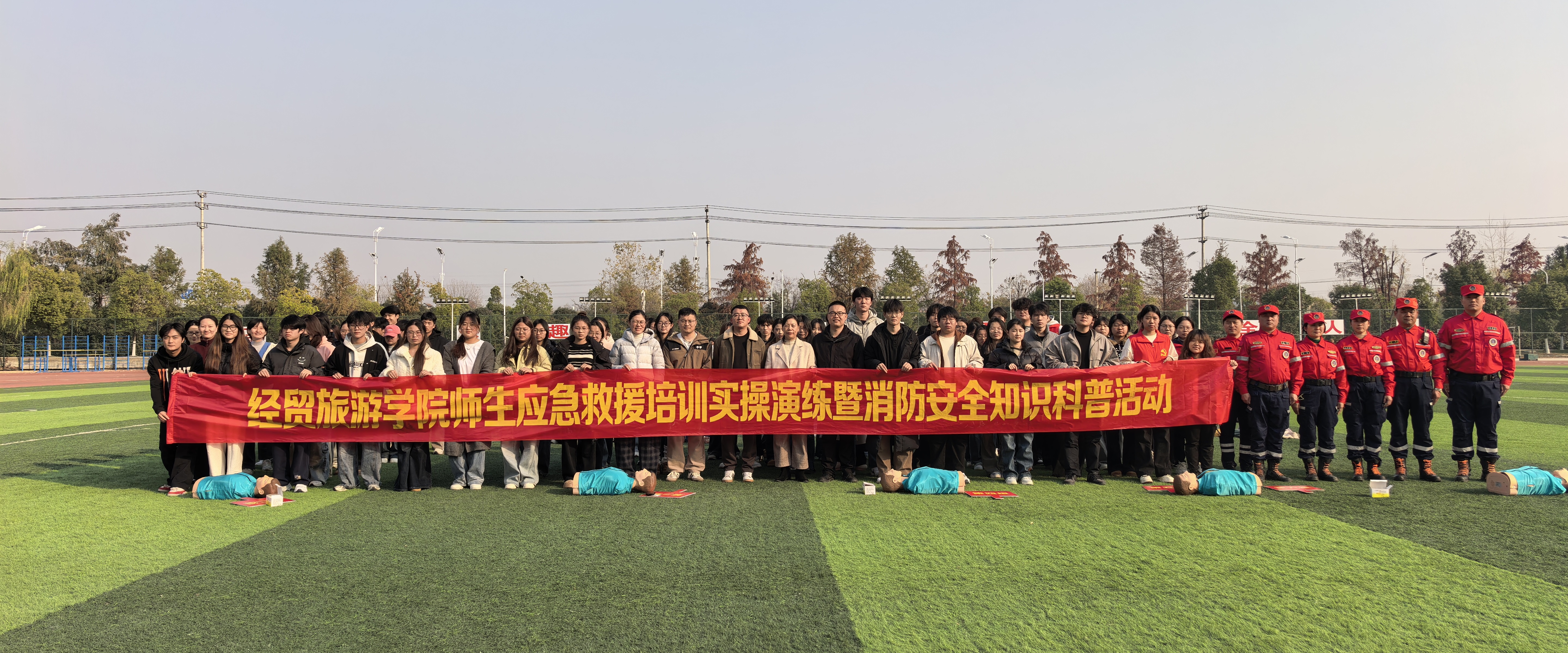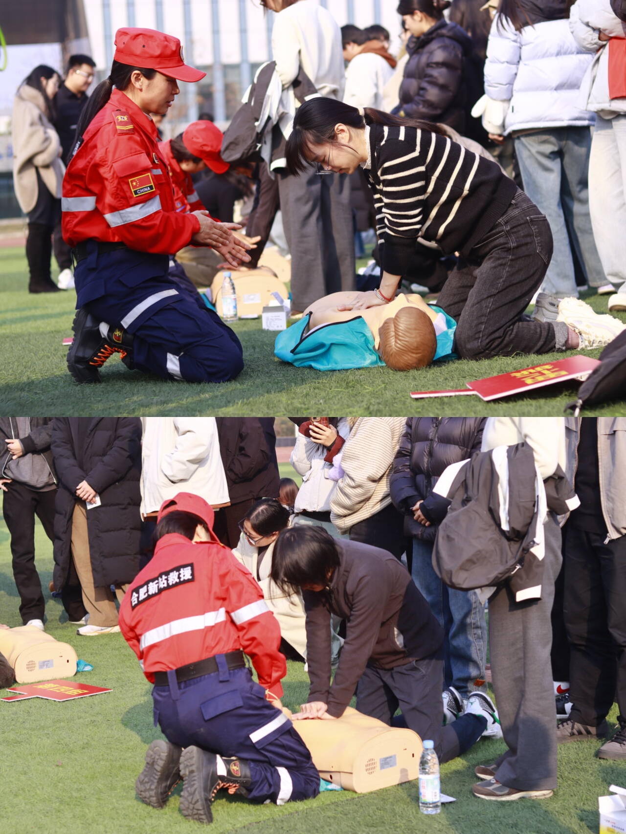 为增强师生安全防范意识,提升应对突发事件的自救互救能力,2025年12月10日下午,经贸旅游学院联合新站高新区团工委、新站高新区应急和城市管理局,在汇心湖校区田径运动场举办了“师生应急救护培训实操演练暨消防安全知识科普活动”。本次活动由经贸旅游学院与新站高新区应急救援队共同承办,学院全体在校班级辅导员、各班班长、生活委员及部分学生会干部参加。