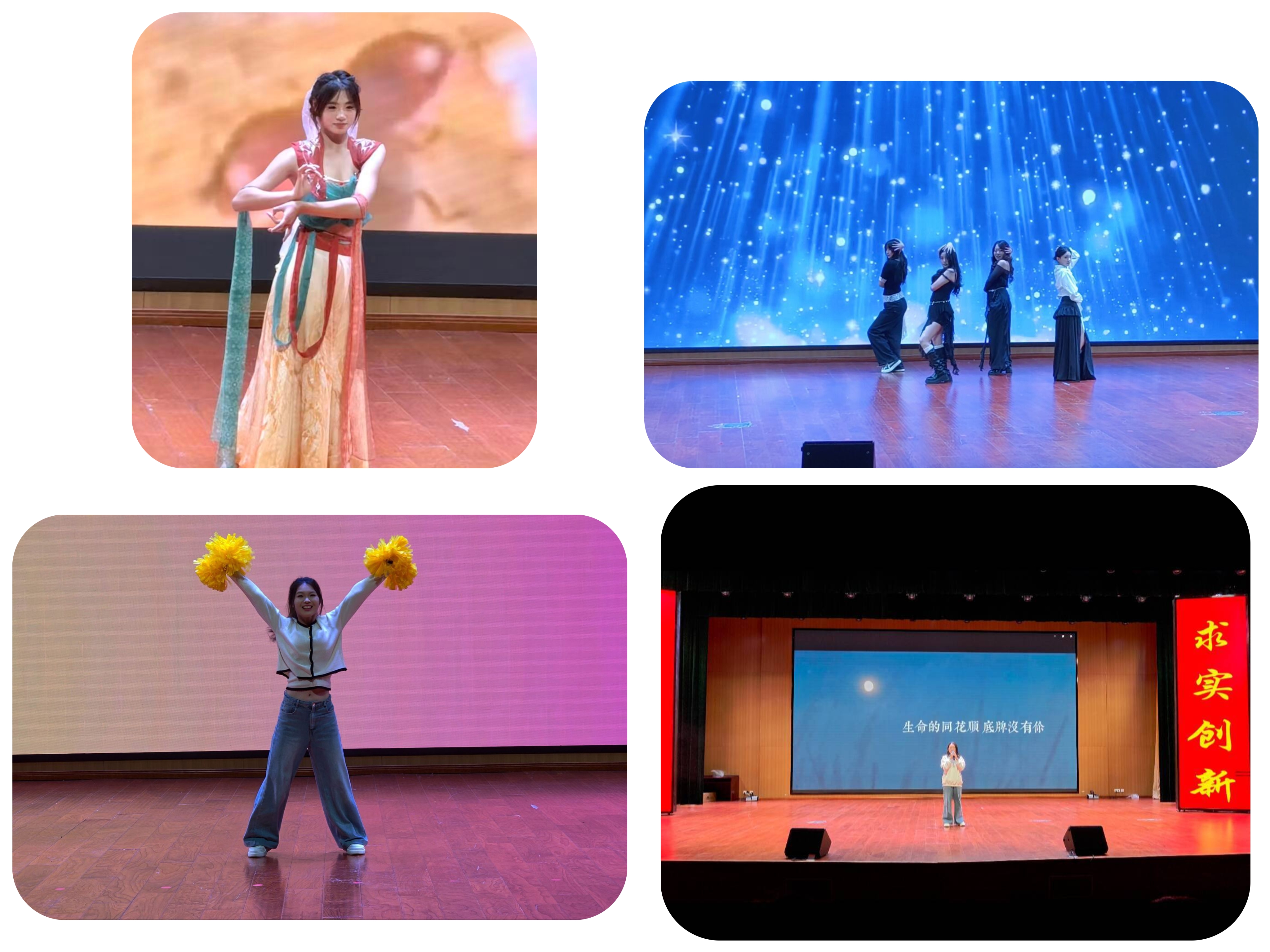 才艺展在热烈的氛围中拉开帷幕,节目形式丰富多样,涵盖了歌曲、舞蹈、古筝演奏等多种艺术形式。齐昕同学则用充满活力的嗓音演绎了《勇气》,激励着大家勇敢追求自己的梦想;许冉同学的《敦煌伎乐天》,以优美的舞姿展现了敦煌文化的神秘与瑰丽,舞者仿佛穿越时空,化身成为敦煌壁画中的飞天仙子;韩丽彤等4位同学带来的《Pink Venom》则充满了现代感与时尚气息,动感的节奏和酷炫的舞蹈动作点燃了全场的气氛。孙睿敏同学用灵动的手指在古筝琴弦上跳跃,演奏出的《繁花》旋律优美动听,如潺潺流水般滋润着观众的心田,展示了传统乐器的独特魅力。Just dance 街舞社的同学们也用充满力量的街舞表演《4 Walls》,将现场气氛推向了高潮。而最值得一提的是王李梅同学带来的花球啦啦操表演,她以饱满的热情、活力四射的动作和极具感染力的笑容征服了现场的每一位观众和评委,最终脱颖而出,荣获本次才艺展的一等奖。