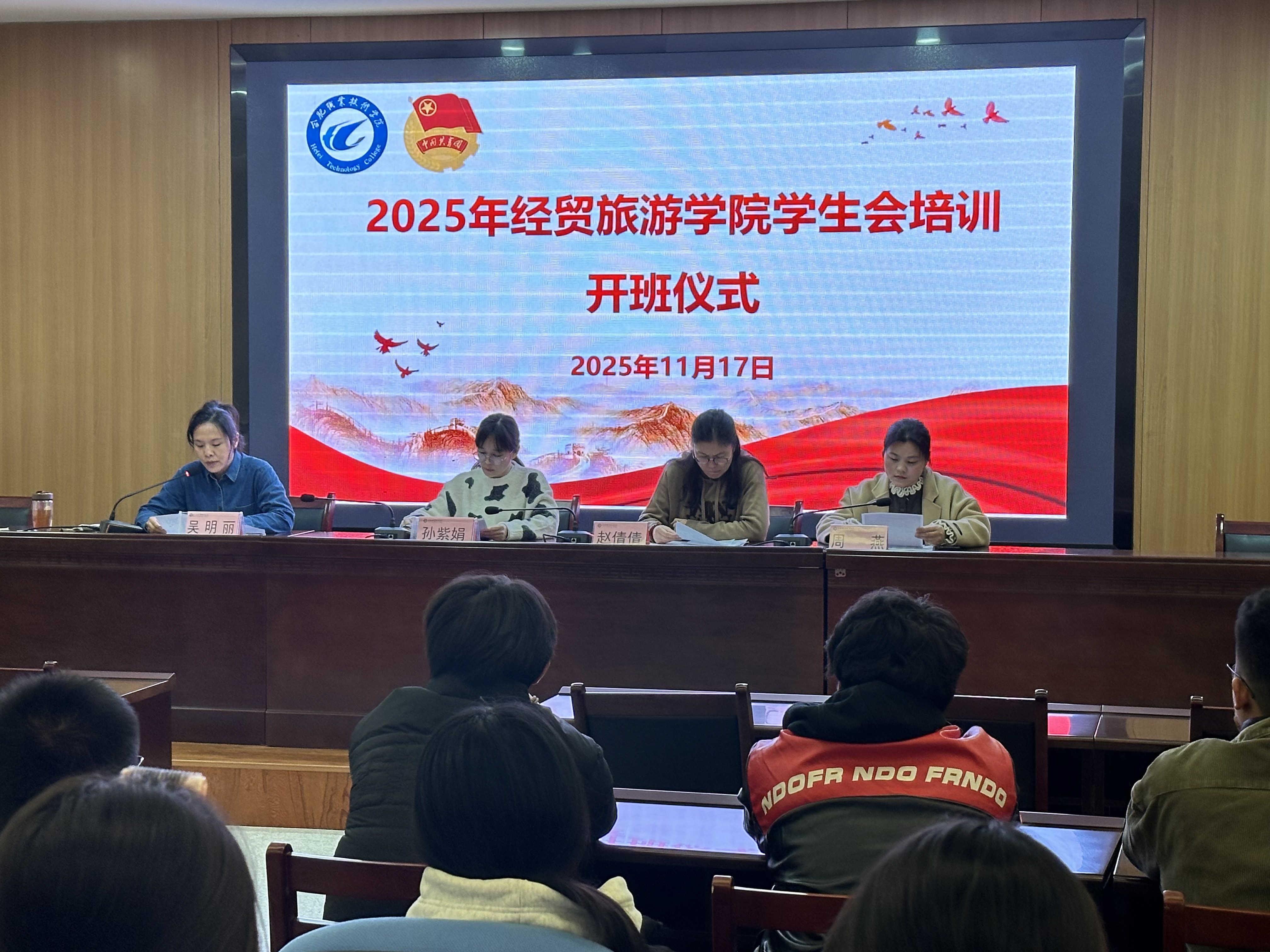 为进一步夯实学生会组织根基,锤炼学生干部的综合素养与服务本领,明晰工作定位与责任担当,11月17日下午,经贸旅游学院团总支在图书馆一楼报告厅举行2025年学生会培训班开班仪式。经贸旅游学院党总支副书记赵倩倩、团总支书记吴明丽、团总支教师兼职副书记周燕、辅导员孙紫娟出席本次仪式。