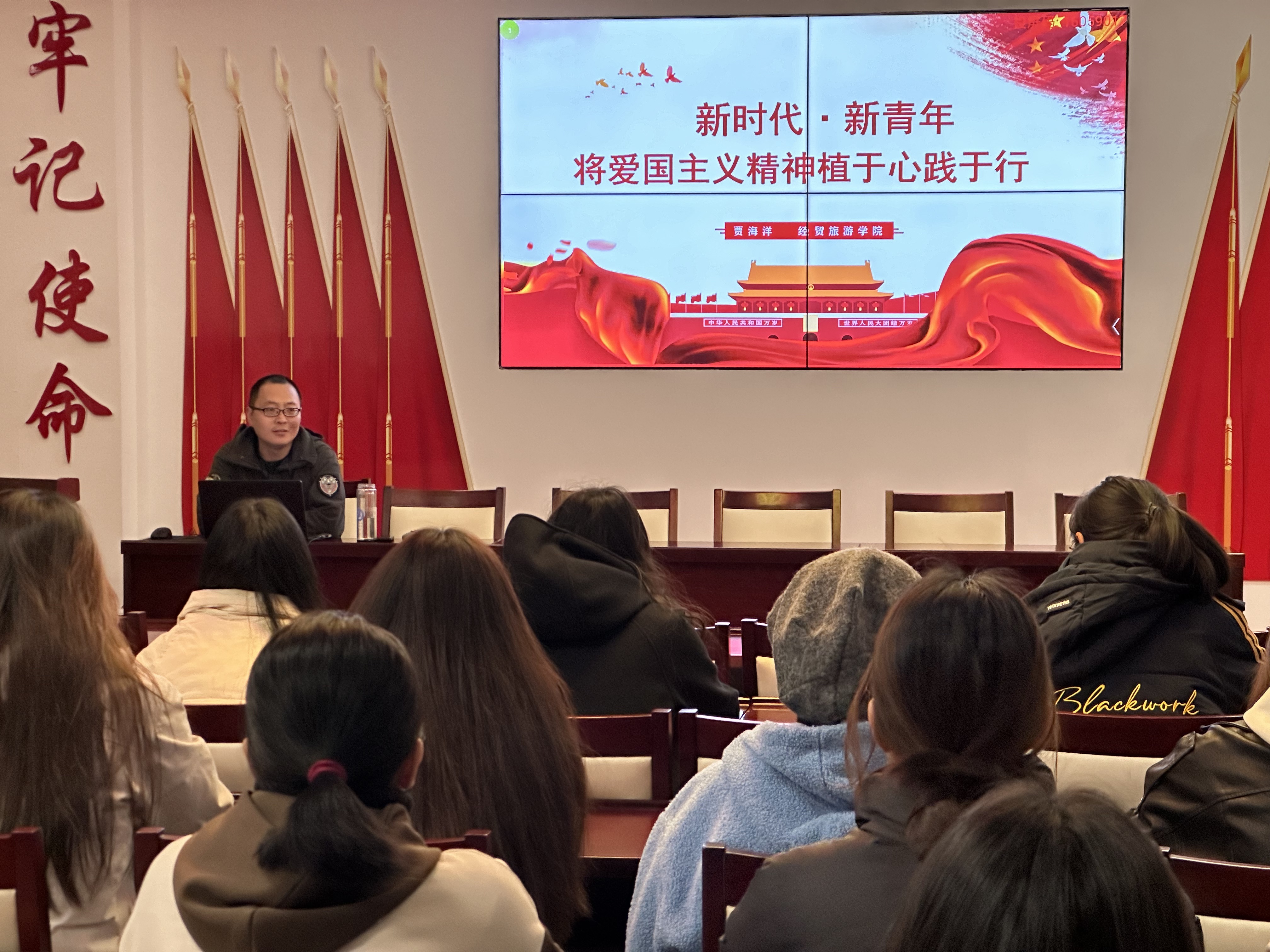 理论领航 爱国铸魂 11月20日在经贸楼党性体验馆,由经贸旅游学院专职组织员贾海洋老师以“新时代 新青年 将爱国主义精神植于心践于行”为主题,以当前世界局势做切入点,聚焦新时代爱国主义精神的核心内涵与实践路径,从理论阐释、情感表达、行动体现三个维度,生动解读青年如何将爱国情、强国志、报国行融入个人发展与成长历程。贾老师通过社团活动展示、爱国实践分享,引导大家以节庆纪念日契机,在日常生活、网络交流、活动开展中践行爱国主义精神,在专业学习、志愿服务、社会实践中勇担青春使命。