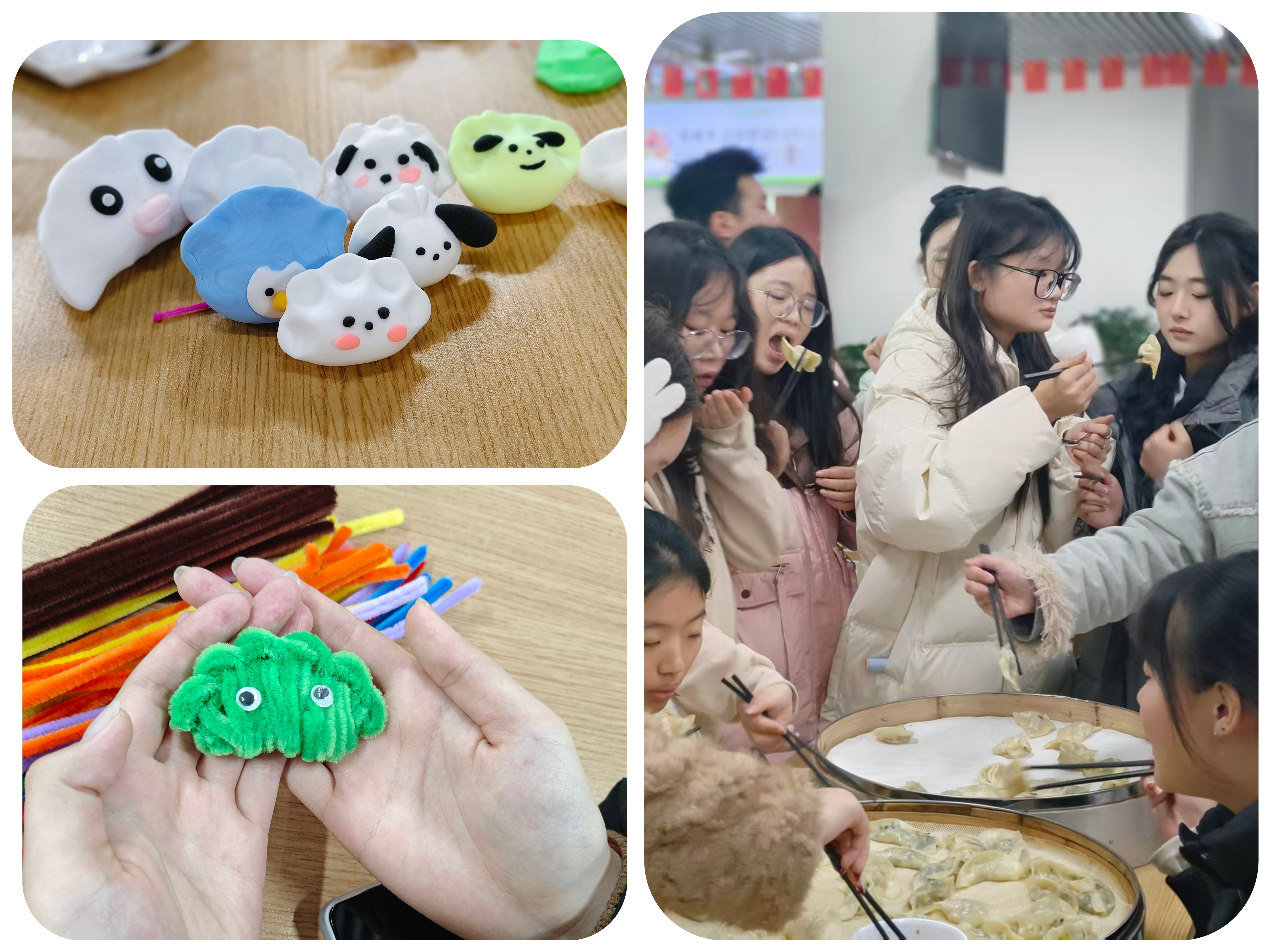 活动期间,同学们纷纷分享自己的真切感受。旅游管理专业的谢欣悦捧着刚出锅的饺子笑着说:“第一次和这么多同学一起包饺子,虽然包的形状歪歪扭扭,但吃着自己亲手包的饺子,感觉特别香!离家这么远,能在学校过这么有氛围的冬至,真的很温暖。”刚完成扭扭棒“饺子”手作的赵文君同学也表示:“平时总待在宿舍里,这次活动不仅让我体验了手工创作的乐趣,还认识了不少新朋友。”