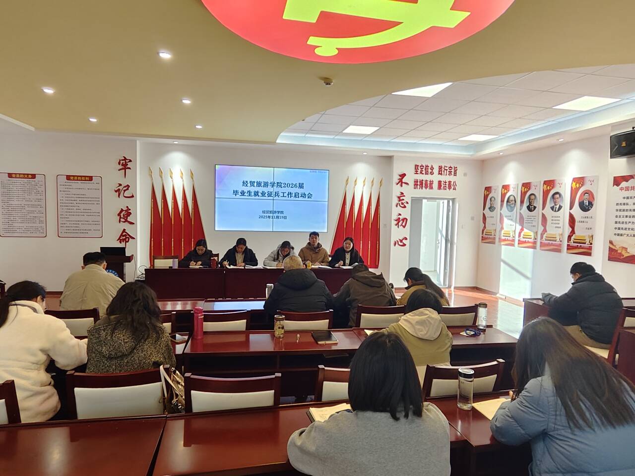 为锚定学院就业目标,精准对接毕业生就业需求,凝聚就业合力,全面推进毕业生就业工作,11月19日,经贸旅游学院召开2026届就业征兵工作启动会。院长赵红、学院党总支副书记赵倩倩、副院长付晓兰、学管办、教管办、就业与实习工作负责人及全体毕业班辅导员参会,会议由学管办主任王明明主持。